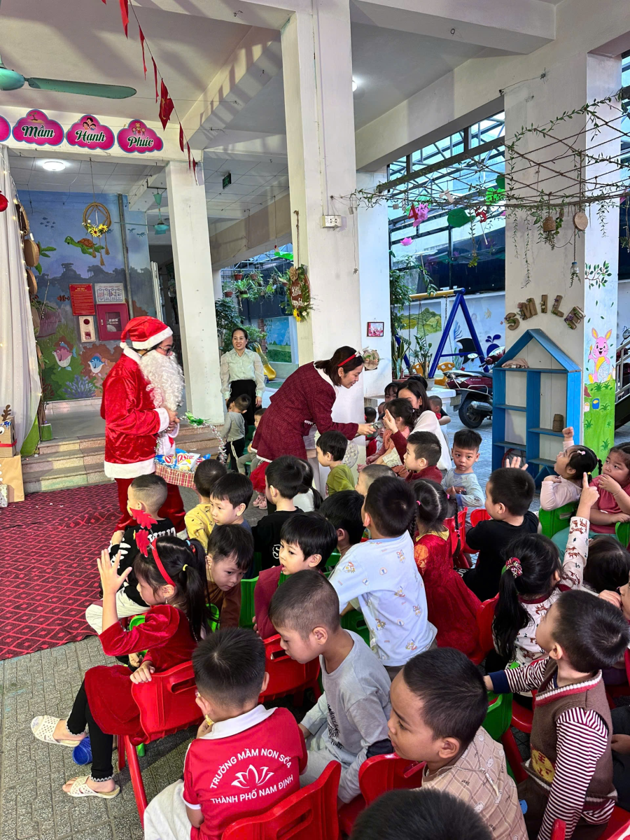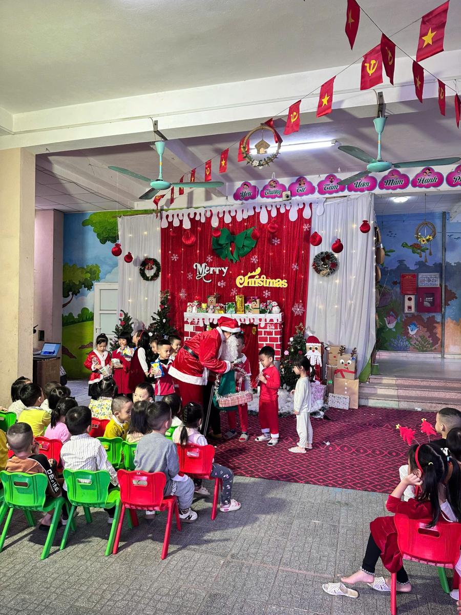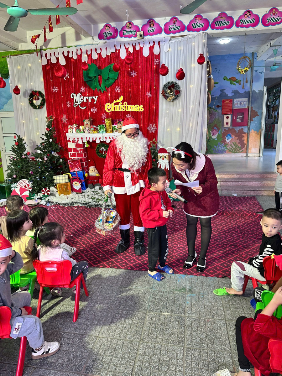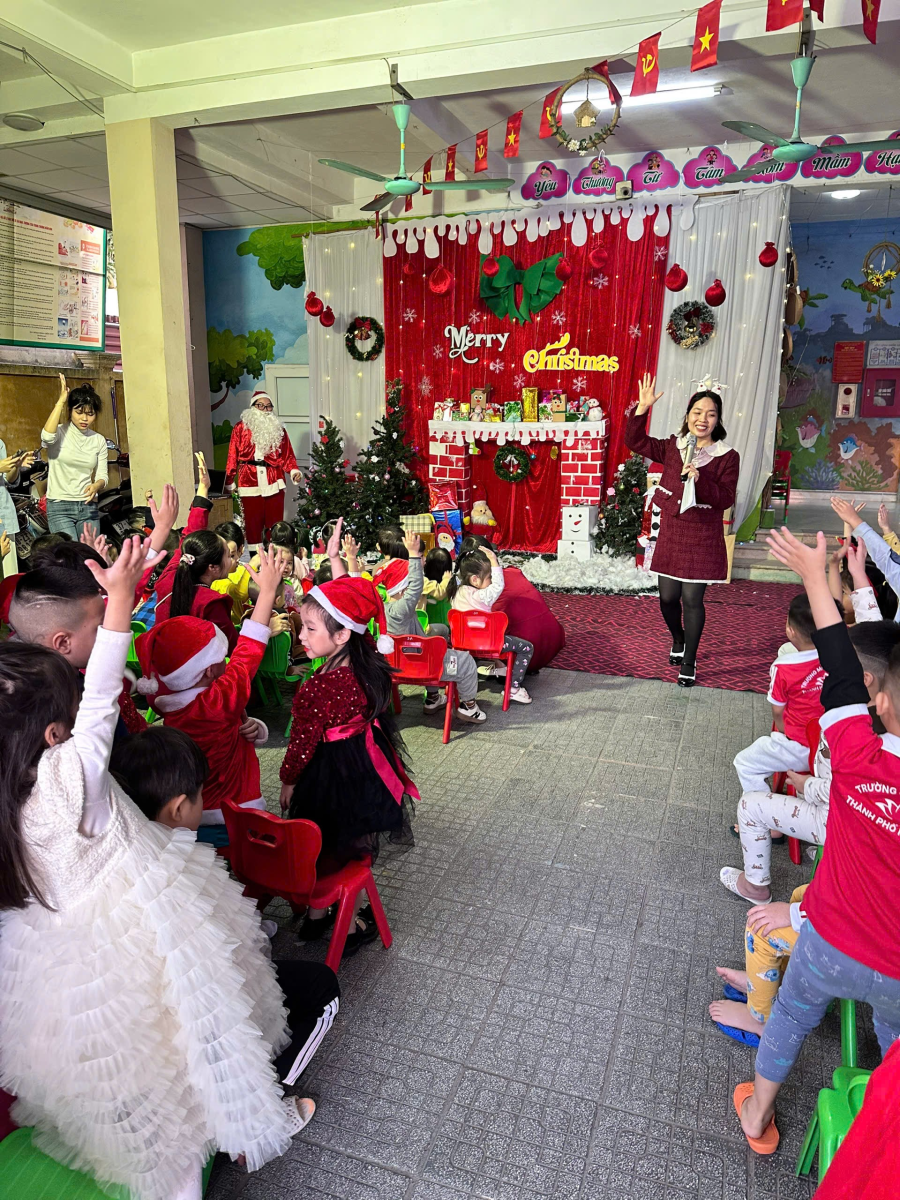 Trong những ngày cuối tháng 12, khuôn viên nhà trường được trang trí rực rỡ với cây thông Noel, các hình ảnh quen thuộc của mùa Giáng sinh, góp phần tạo nên môi trường học tập sinh động và thân thiện. Các bé được tham gia các hoạt động như nghe kể chuyện Giáng sinh, ca hát, làm đồ trang trí đơn giản và giao lưu cùng “ông già Noel”, qua đó giúp trẻ mạnh dạn, tự tin và phát triển kỹ năng giao tiếp.