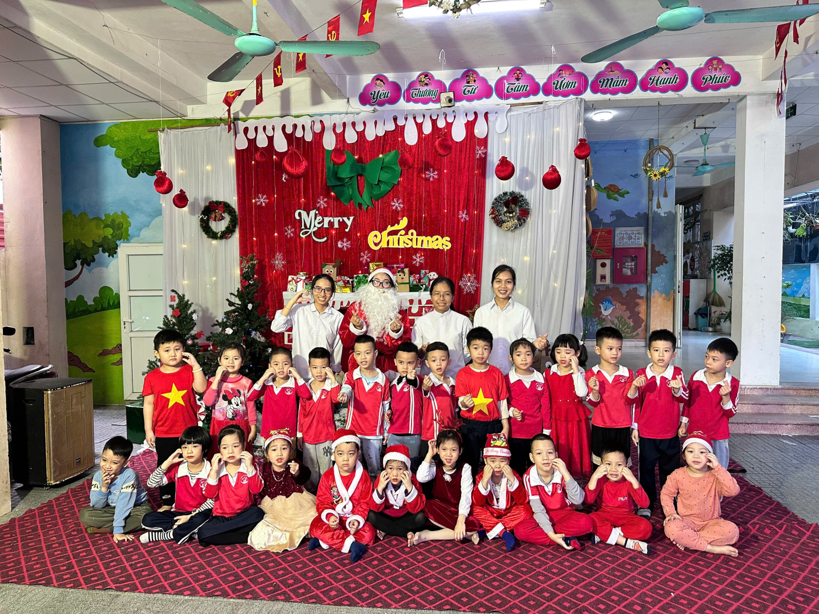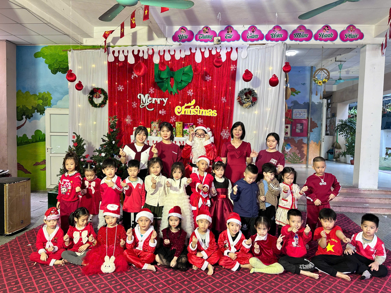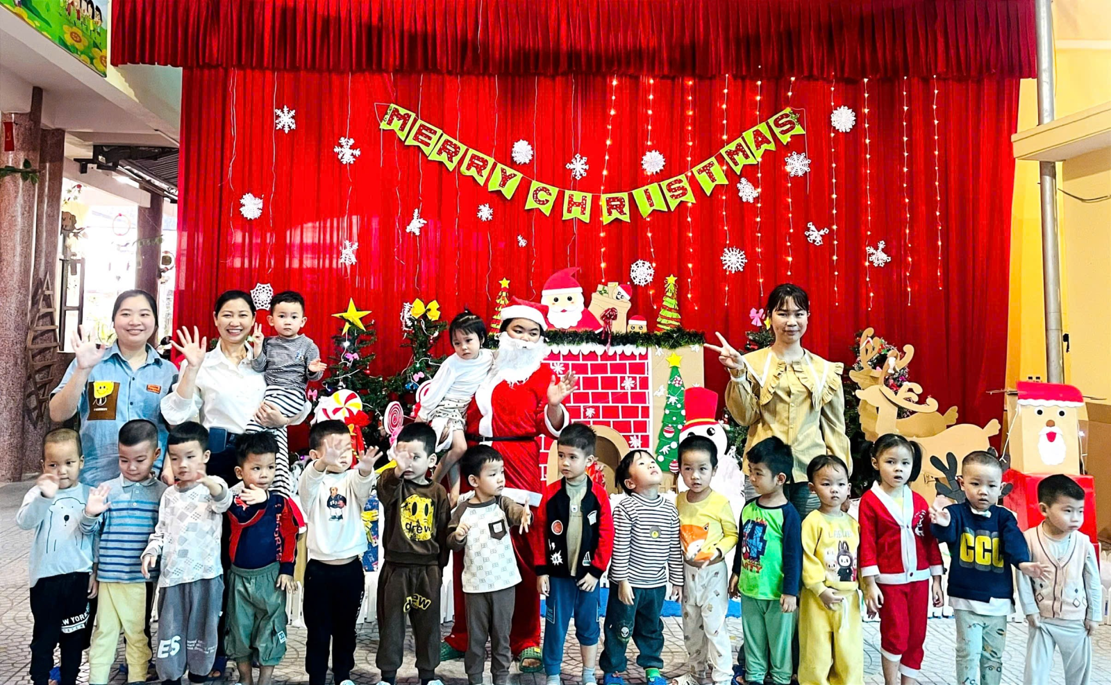 Trong những ngày cuối tháng 12, khuôn viên nhà trường được trang trí rực rỡ với cây thông Noel, các hình ảnh quen thuộc của mùa Giáng sinh, góp phần tạo nên môi trường học tập sinh động và thân thiện. Các bé được tham gia các hoạt động như nghe kể chuyện Giáng sinh, ca hát, làm đồ trang trí đơn giản và giao lưu cùng “ông già Noel”, qua đó giúp trẻ mạnh dạn, tự tin và phát triển kỹ năng giao tiếp.