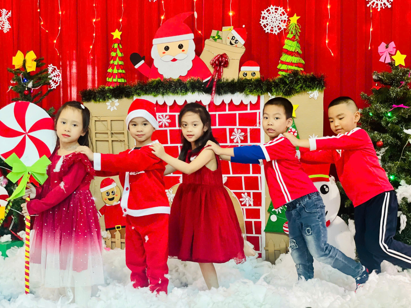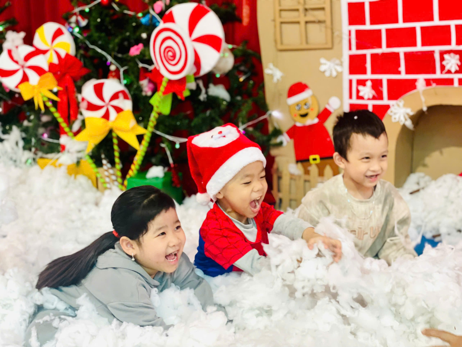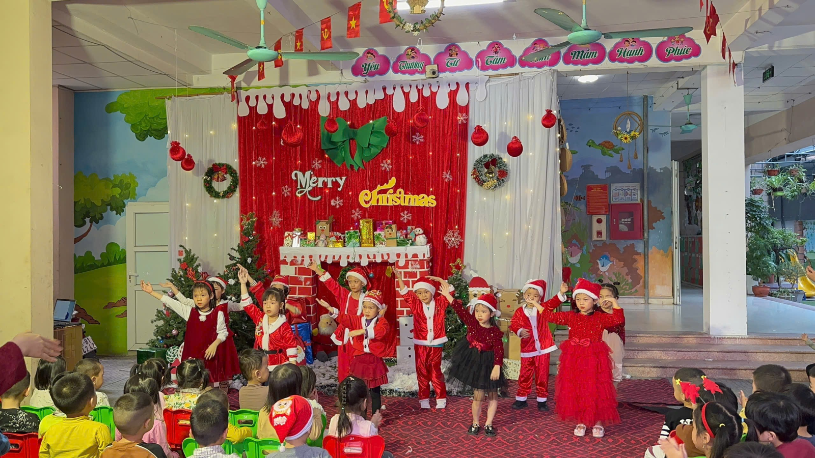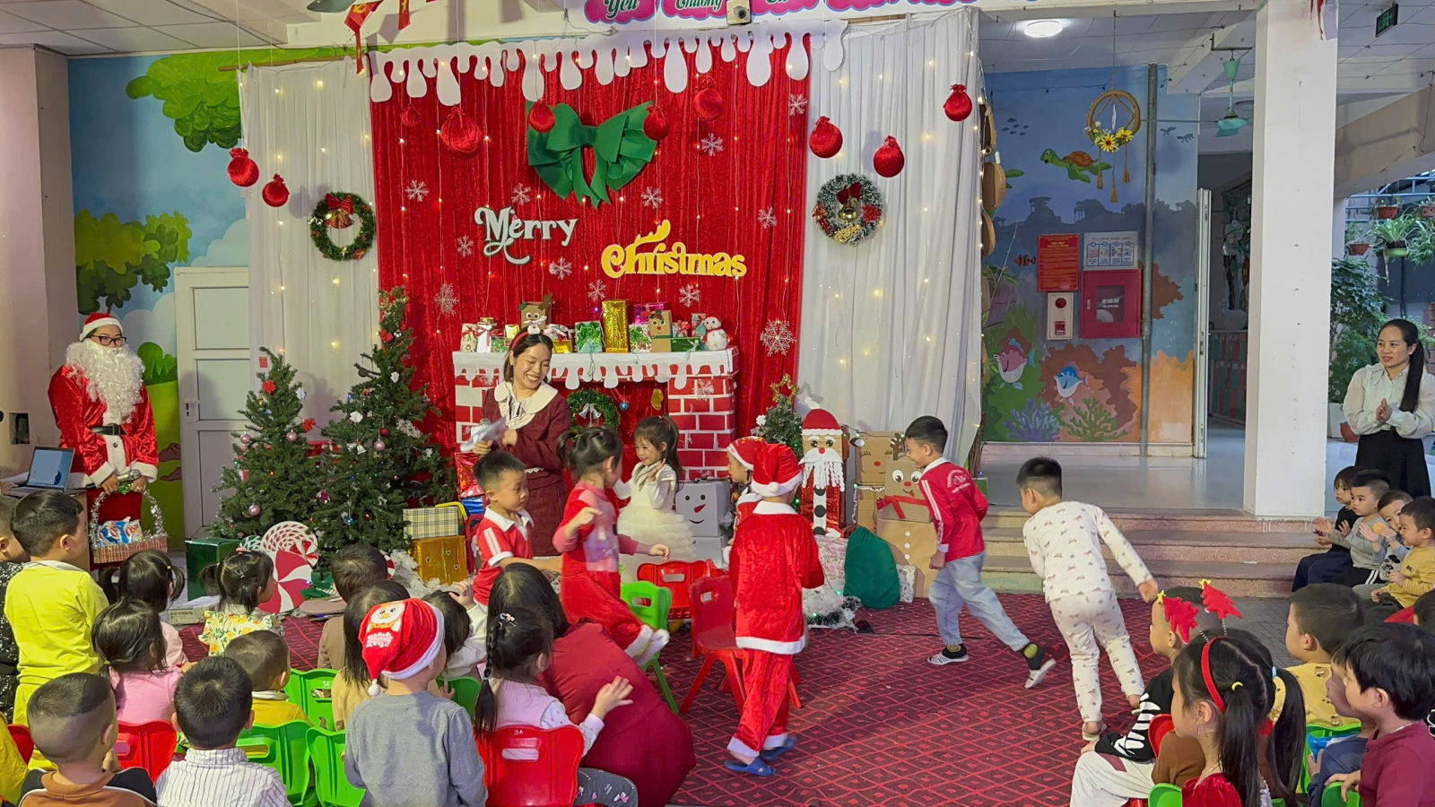 Trong những ngày cuối tháng 12, khuôn viên nhà trường được trang trí rực rỡ với cây thông Noel, các hình ảnh quen thuộc của mùa Giáng sinh, góp phần tạo nên môi trường học tập sinh động và thân thiện. Các bé được tham gia các hoạt động như nghe kể chuyện Giáng sinh, ca hát, làm đồ trang trí đơn giản và giao lưu cùng “ông già Noel”, qua đó giúp trẻ mạnh dạn, tự tin và phát triển kỹ năng giao tiếp.