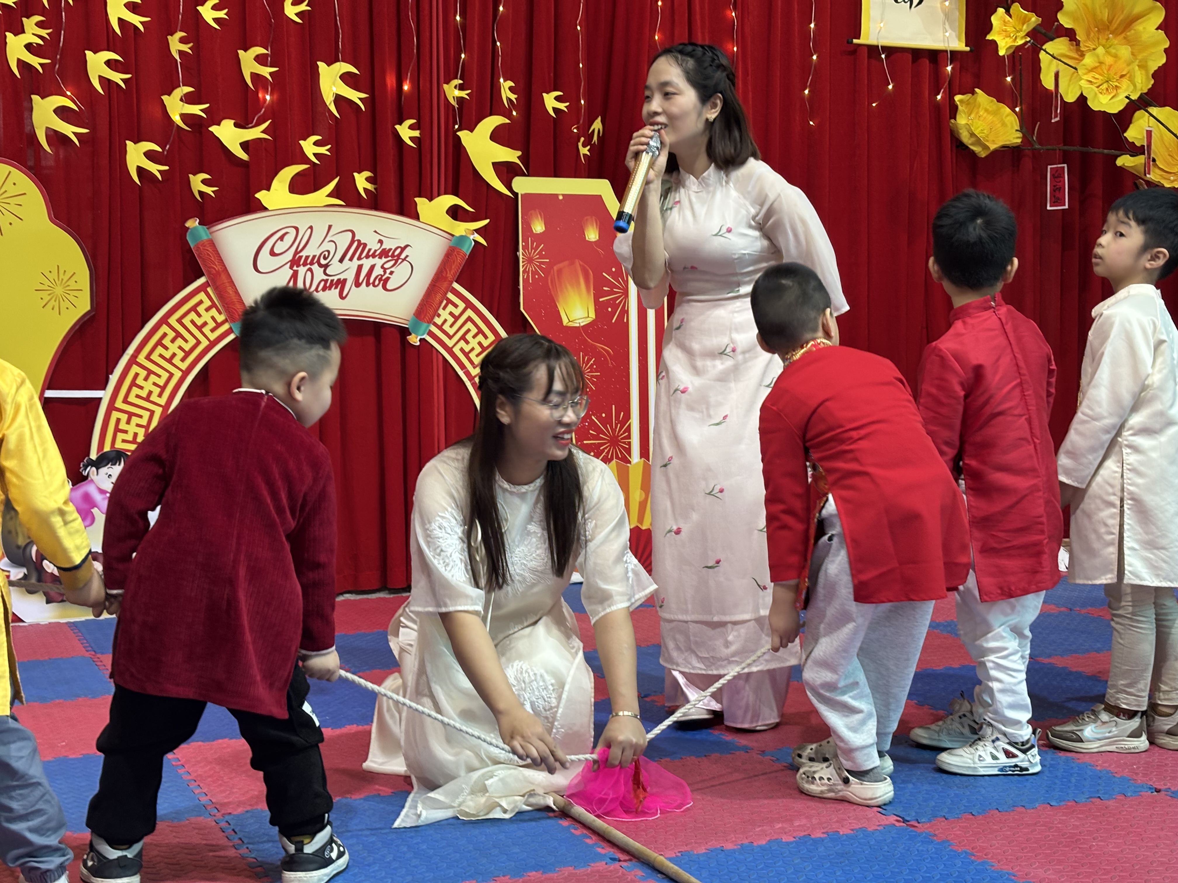 Bên cạnh hoạt động văn nghệ, chương trình còn tổ chức các trò chơi dân gian ngày Tết, tạo nên không khí sôi nổi và đầy tiếng cười. Thông qua việc tham gia các trò chơi dân gian, trẻ được vận động, rèn luyện sức khỏe, phát triển sự nhanh nhẹn, khéo léo, đồng thời hình thành tinh thần đoàn kết, hợp tác và tuân thủ luật chơi.